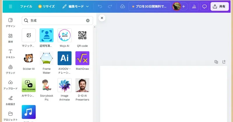 CanvaでAI画像生成を行うには、アプリ内の「マジック生成」機能を利用します。この機能は、デザイン作成画面の中に組み込まれており、簡単にアクセスできます。