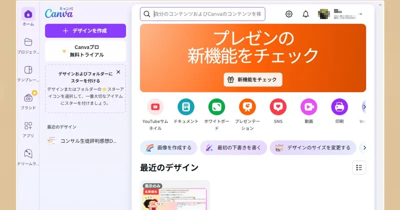 ログイン後、ホーム画面から「デザインを作成」をクリックします。テンプレートを選択するか、自分でカスタムサイズを指定して作業画面に進みましょう。 - アプリ機能の有効化